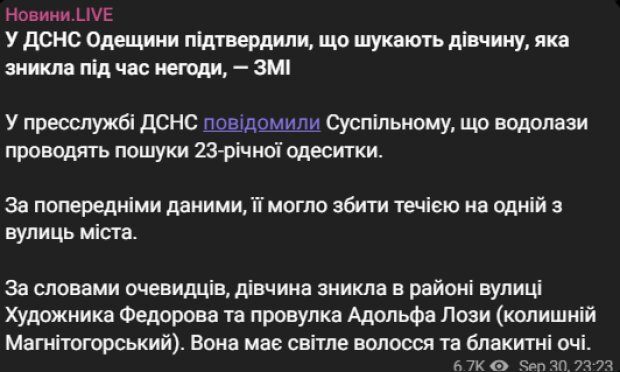 Кроме того, во время шторма пропала без вести 23-летняя женщина. Очевидцы сообщили, что её, возможно, унесло мощным потоком воды в районе пересечения улицы Фёдорова и переулка Адольфа Лозы. К поискам присоединились водолазы, и тело девушки было обнаружено на следующее утро.