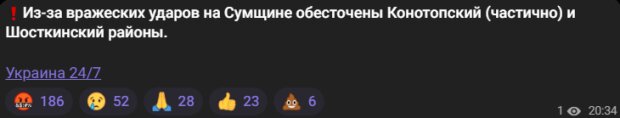 Крім цього, проблеми зі світлом вже й у Сумській області: знеструмлено Конотопський (частково) та Шосткинський райони.