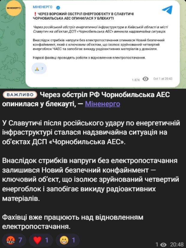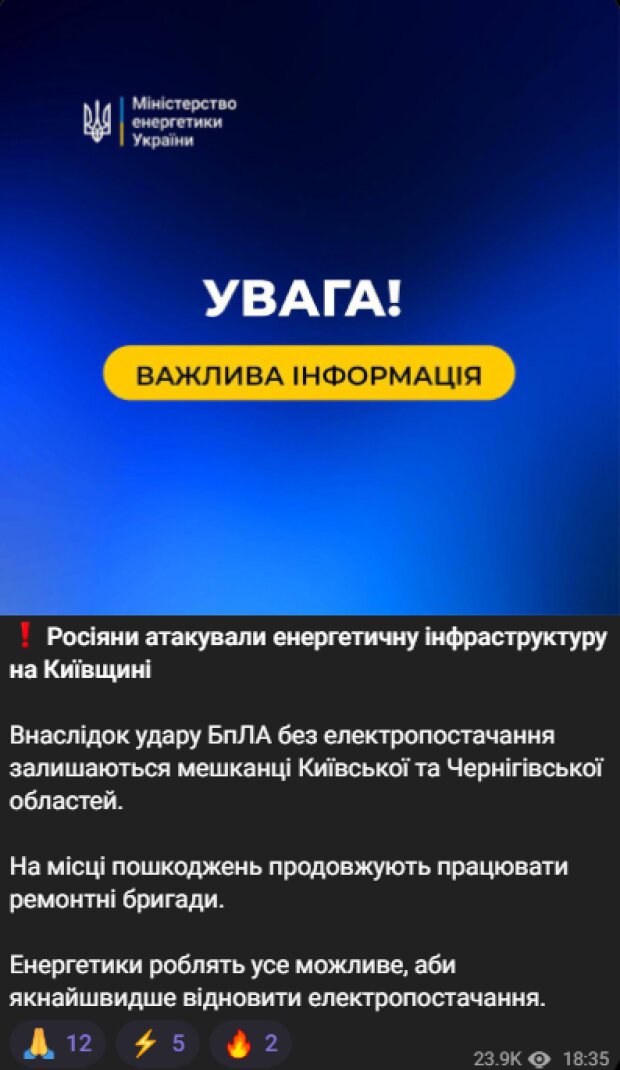 В результате масштабного удара российского беспилотника 1 октября энергетическая инфраструктура Киевской и Черниговской областей получила значительный ущерб. Были введены аварийные отключения, в результате чего около 307 000 человек остались без электроэнергии.