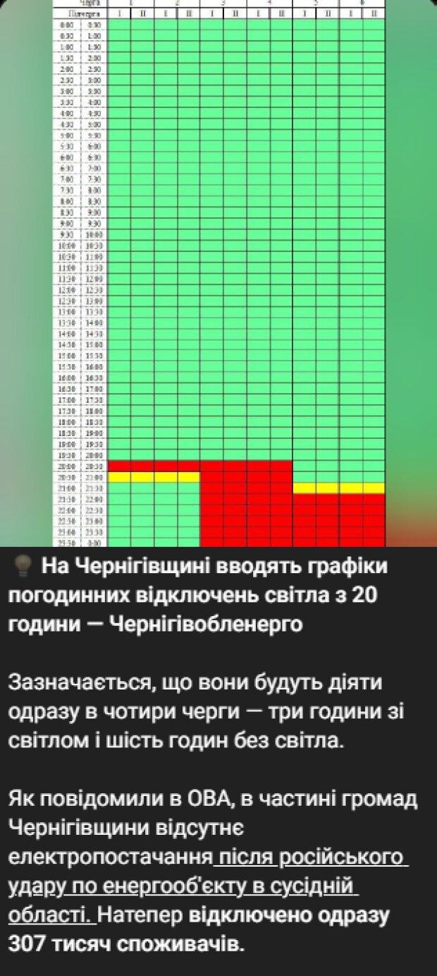 Отмечается, что в Черниговской области вводят графики почасовых отключений света с 20 часов, за явили в Черниговоблэнерго. Сразу введено четыре очереди перебоев: люди будут по три часа со светом и по шесть часов без.
