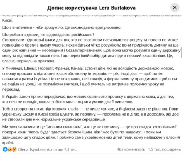 Публікація Бурлакової викликала широкий резонанс у соціальних мережах, зібравши безліч лайків, ріпостів та коментарів від батьків, які поділилися подібним досвідом подолання труднощів, пов'язаних із здобуттям повноцінної україномовної освіти для своїх дітей.